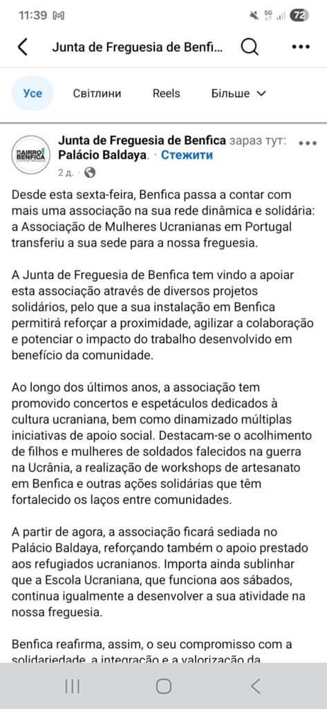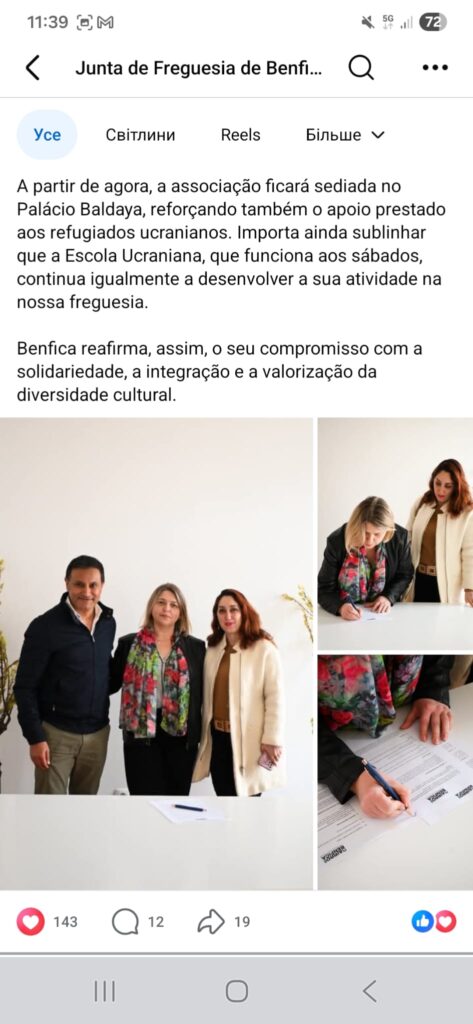 Щиро дякуємо районній раді Junta de Freguesia de Benfica за підтримку та надане приміщення. Ваша допомога вже не вперше робить можливими наші ініціативи та об’єднує українську громаду.