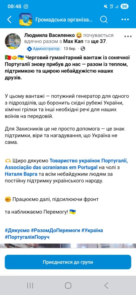 Завдяки спільним зусиллям Товариство українок Португалії, Associação das ucranianas em Portugal вдалося зробити ще одну важливу справу — придбати та відправити черговий інверторний генератор для наших Захисників на Сумщину. Разом із ним також передали теплі дитячі речі для сиротинця, сухі грілки та іншу необхідну допомогу для наших Незламних.